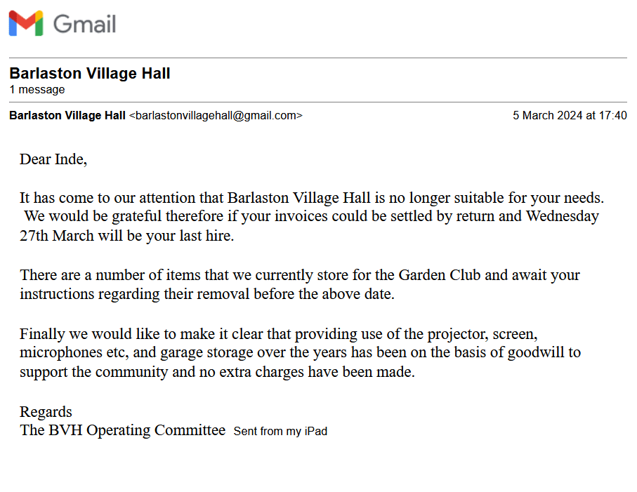 Unfortunately the Village Hall were unable to provide the required equipment for our pre booked meetings, approxe half our meetings in 2023 were disrupted due to double bookings or missing tables, cable, projector equipment. So the operating committee decided they could not provide the equipment any more and cancelled the meetings as per their email below.